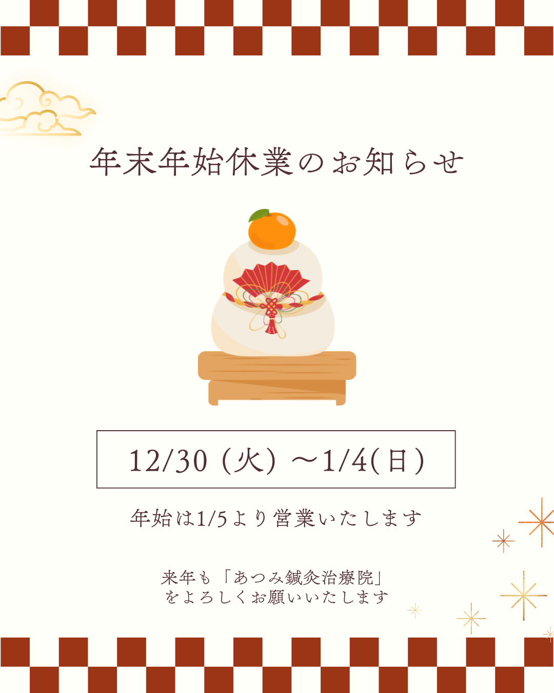 12月30日(火)~1月4日(日)までお休みをいただきます。